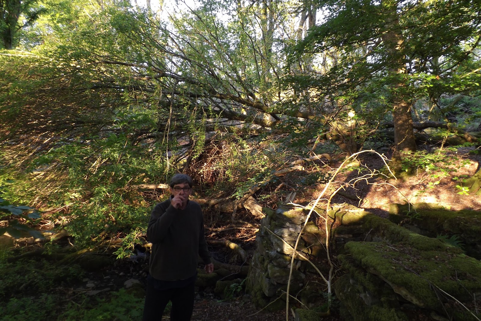 One appeared to be resting on the roof of the piggery, but clean up from that storm seemed to be progressing slowly. After inspecting the little stream and the downed trees, we walked back up to the field behind the main house.